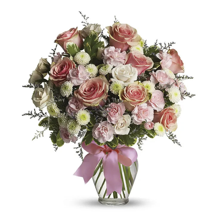 Sweet as candy! This soft pink and white bouquet is a feminine choice for any occasion. A mix of pink and white flowers including roses, miniature carnations and button spray chrysanthemums is delivered in a spring garden vase adorned with pink ribbon. Orientation: All-Around